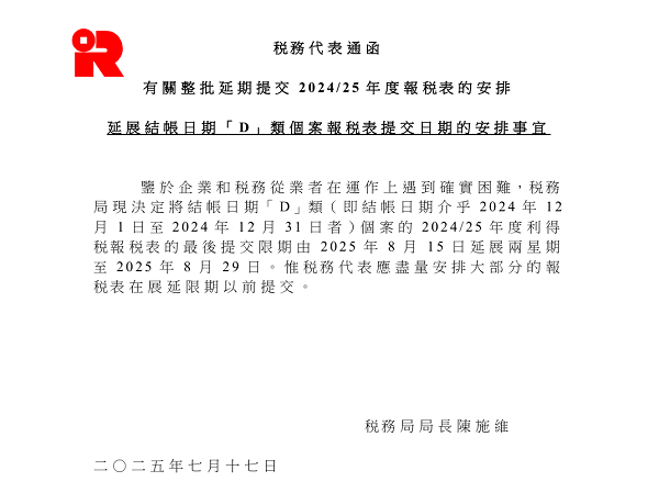 香港稅務局于2025年7月17日發布通告,鑒于企業與稅務服務機構的年底結賬操作困難,正式延長D類公司(財務年度結束于2024年12月1日-31日)的利得稅申報期限——由原定的2025年8月15日延后兩周至2025年8月29日。本次延期旨在緩解申報壓力,但需注意8月29日為最終截止日,逾期將面臨合規風險。