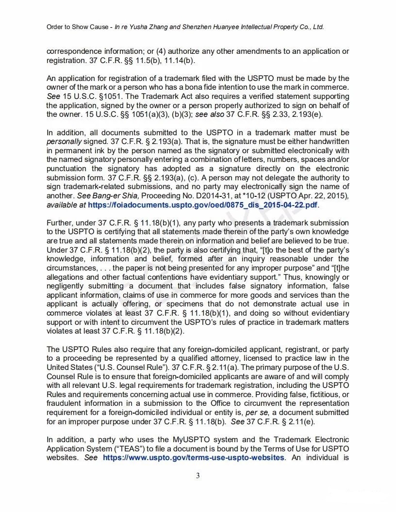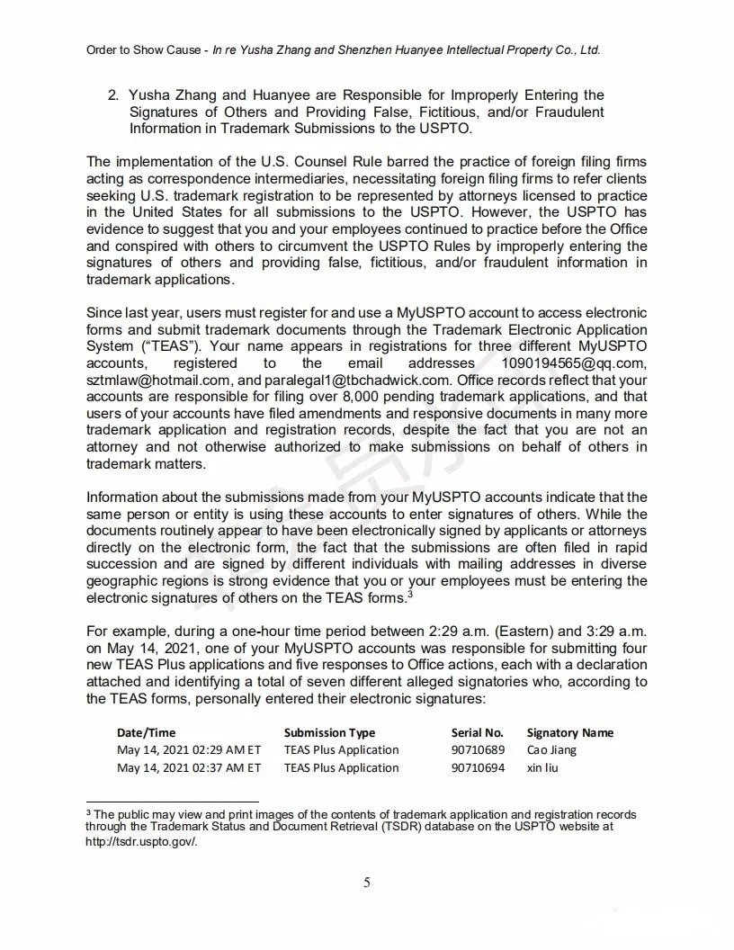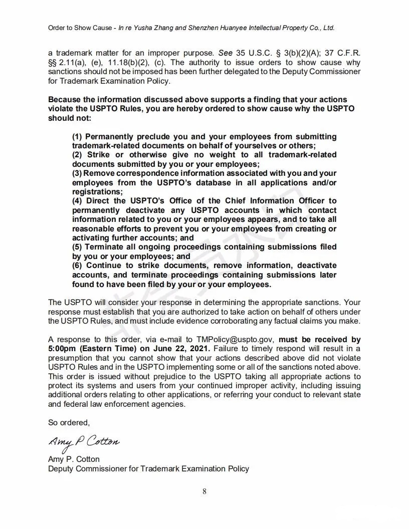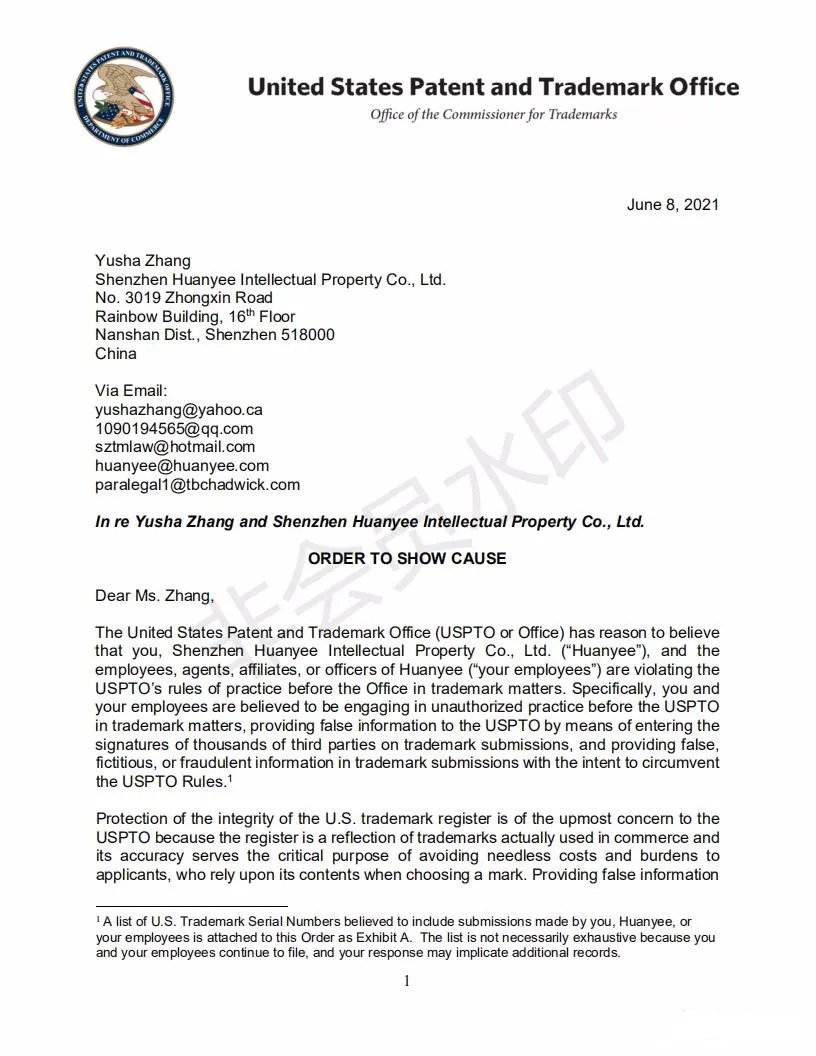 2021年6月8日,美國專利商標(biāo)局(USPTO)向中國深圳一家知識產(chǎn)權(quán)公司的代表人發(fā)出一份123頁的“ORDER TO SHOW CAUSE”。對該公司代理提交的批量美國商標(biāo)的行為,尤其是其中涉及到第三方簽名提供虛假、虛構(gòu)和欺詐信息的行為提出質(zhì)疑,要求該公司提出合理的理由,并在美國東部時間6月22日下午5:00前進(jìn)行回復(fù)。否則USPTO將會對該代理機構(gòu)以及代表人進(jìn)行制裁。
