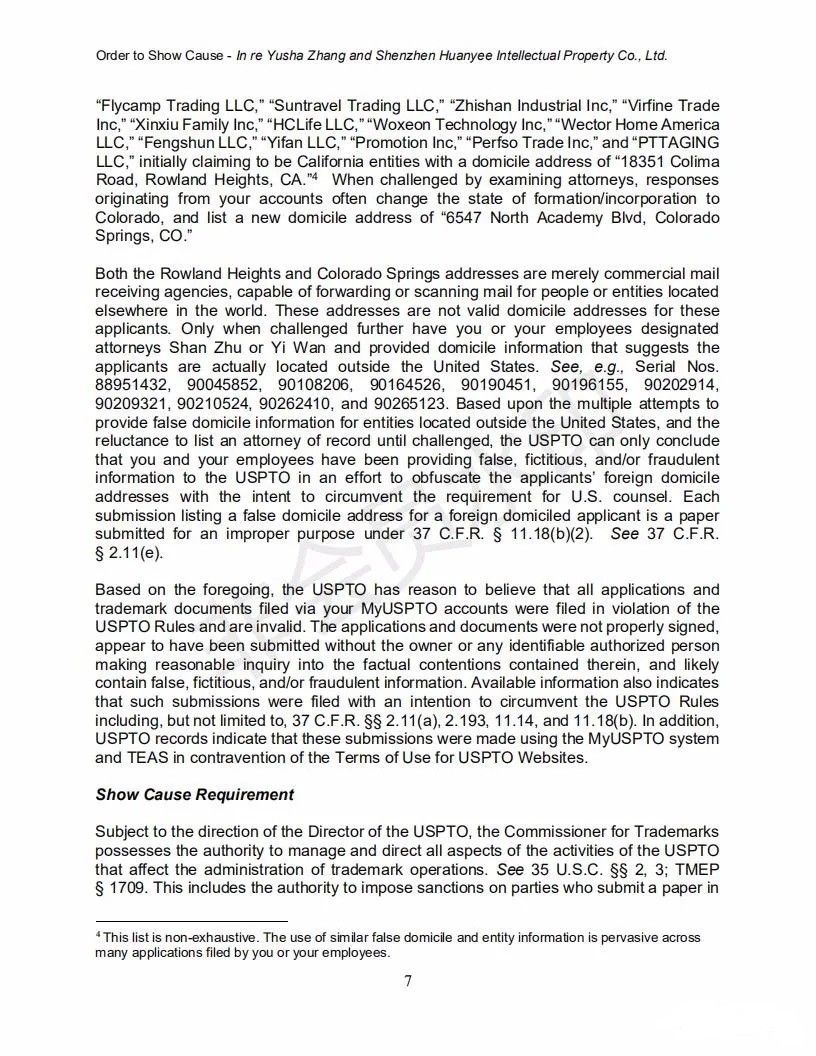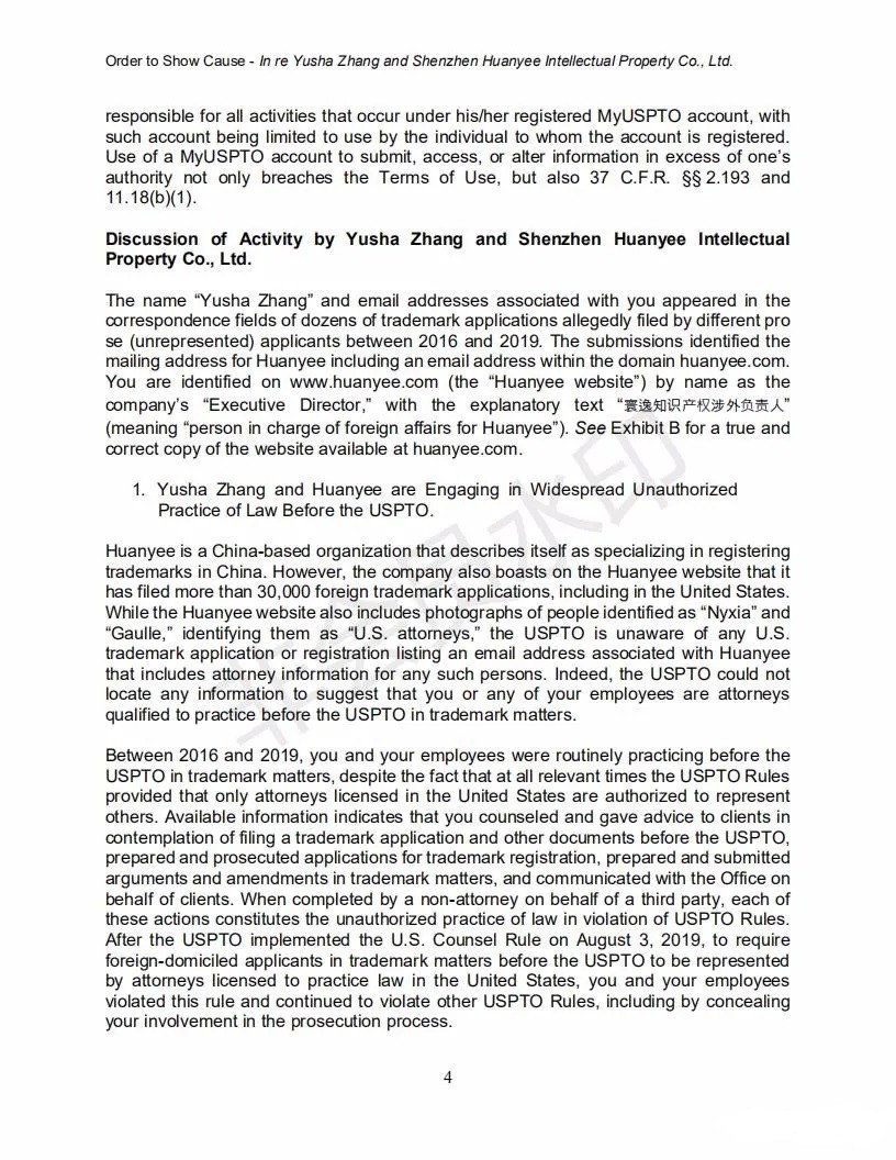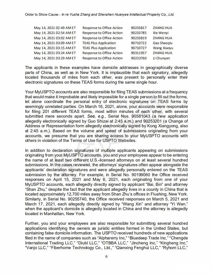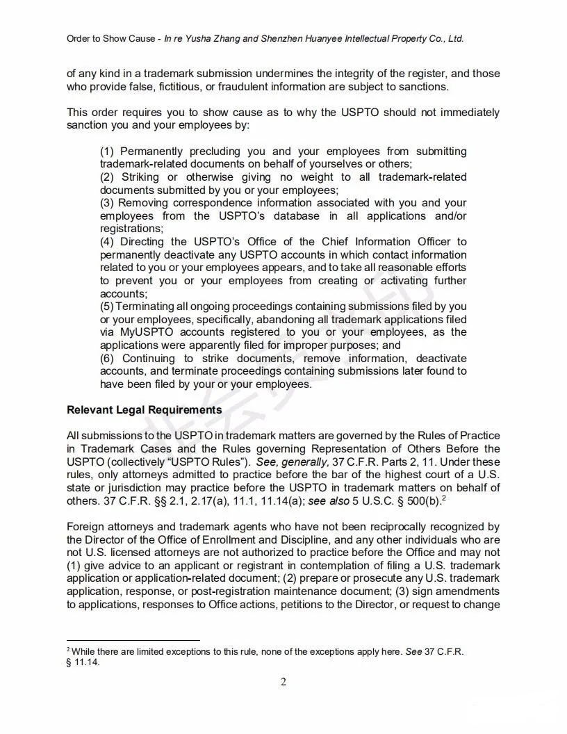 2021年6月8日,美國專利商標(biāo)局(USPTO)向中國深圳一家知識產(chǎn)權(quán)公司的代表人發(fā)出一份123頁的“ORDER TO SHOW CAUSE”。對該公司代理提交的批量美國商標(biāo)的行為,尤其是其中涉及到第三方簽名提供虛假、虛構(gòu)和欺詐信息的行為提出質(zhì)疑,要求該公司提出合理的理由,并在美國東部時間6月22日下午5:00前進(jìn)行回復(fù)。否則USPTO將會對該代理機構(gòu)以及代表人進(jìn)行制裁。