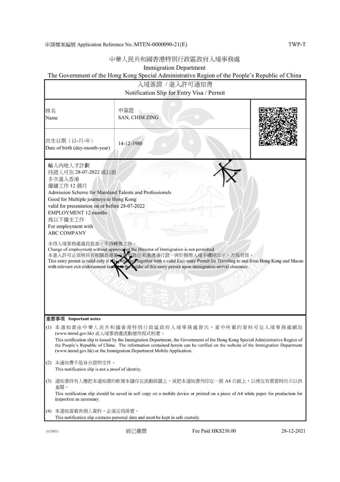 「電子簽證」載有加密二維碼供核實該證之用。有關人士(例如「電子簽證」持有人的準雇主)可使用入境處流動應用程式掃描該二維碼檢視相關資料。使用其他相機裝置或流動應用程式掃描該二維碼將無法檢視相關資料。此外,有關人士亦可在香港政府一站通網站或入境處流動應用程式(APP)輸入「電子簽證」資料,以核實該證。