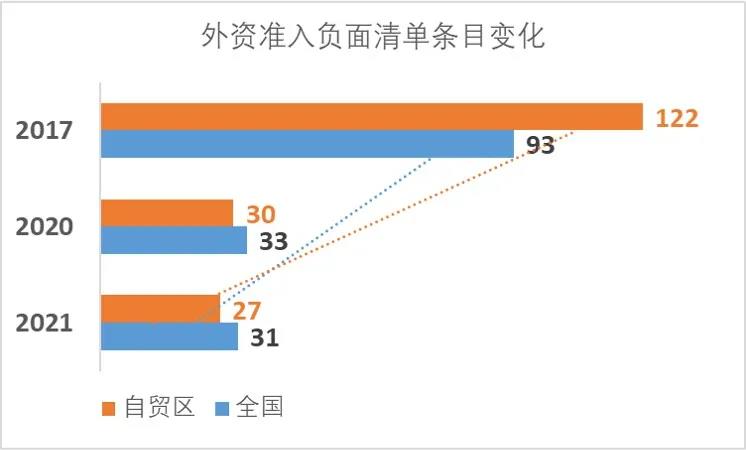 2021年版全國和自貿(mào)試驗(yàn)區(qū)外資準(zhǔn)入負(fù)面清單,進(jìn)一步縮減至31條、27條,壓減比例分別為6.1%和10%。2017年至2020年,我國連續(xù)四年修訂全國和自貿(mào)試驗(yàn)區(qū)負(fù)面清單,外資準(zhǔn)入特別管理措施分別由93項(xiàng)、122項(xiàng)減至33項(xiàng)、30項(xiàng)。